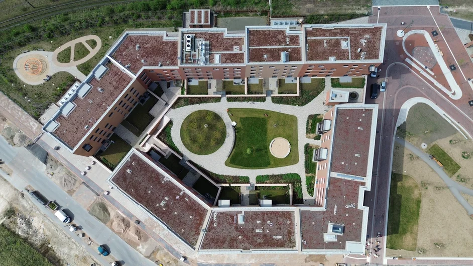 Für die Hochbauplanung wurde ein bundesweiter Architektenwettbewerb ausgelobt und das renommierte hannoversche Architekturbüro BKSP mit dem 1. Preis gekürt. Auf dem 8.722 m² großen Grundstück ist eine attraktive, gestaffelte Blockrandbebauung mit straßenseitig strukturierter Vollklinkerfassade geplant. Eine besondere Wohnqualität entsteht zusätzlich durch den weitläufigen begrünten und als Garten gestalteten Innenhof. Im Erdgeschoss des Gebäudes befinden sich insgesamt 11 Gewerbeeinheiten in unterschiedlichen Größen von ca. 70 m² - 1.600 m² Verkaufsfläche, für verschiedenste Nutzungskonzepte. In den vier Obergeschossen entstehen 116 1- bis 4 Zimmer-Wohnungen mit Wohnflächen von ca. 30 m² bis 110 m² und einer durchschnittlichen Wohnfläche von ca. 68 m².