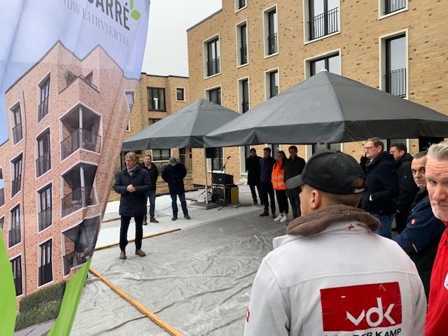 • Am 29.11.2022 wurde das Richtfest für die 39 Wohnungen inkl. TG-Stellplatz in vier 3,5 geschossigen Mehrfamilienhäusern mit einer Wohnfläche zwischen 60 und 117 m² gefeiert.
